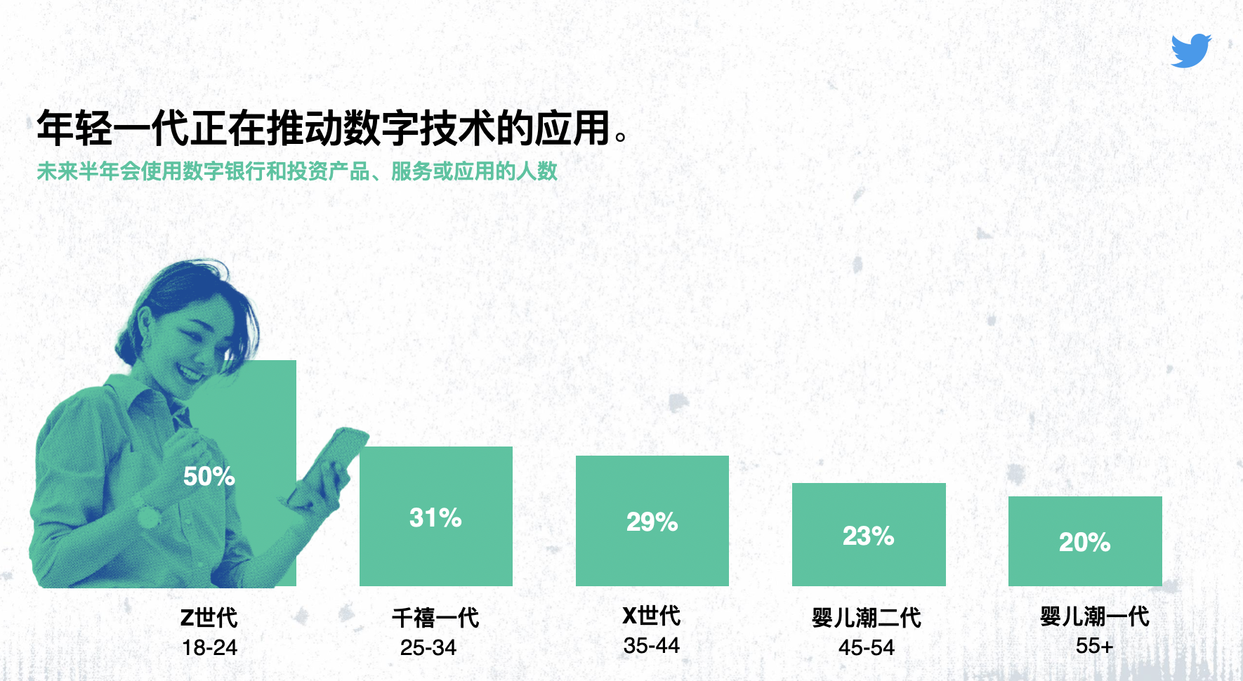 与互联网一起生长的Z代代对技能的运用称心如意,他们运用数字服务的份额比55岁以上的人群高出191%。在未来半年,方案运用数字银行和出资产品、服务和运用的Z代代将添加50%。作为Twitter对话添加的重要引擎,Z代代的声响正在推进金融数字化浪潮。