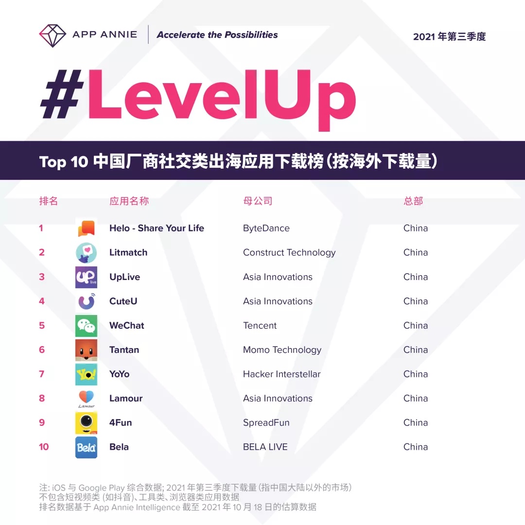 App Annie:2021 Q3,字节跳动旗下社交应用海外热度超过 WeChat