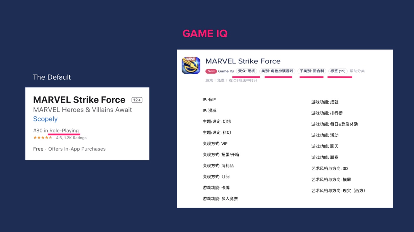 Vanessa举例弥补道:“有了Game IQ,咱们能够了解一款游戏有什么十分大的差异之处。以使用商铺中的一款Marvel游戏举例。这款游戏在使用商铺显现出它是一个角色扮演类的游戏,但如何能协助咱们了解这款游戏真实的主意呢?这儿给到的信息量就并不是太多。而假如在Game IQ又会怎样去看这款游戏?
