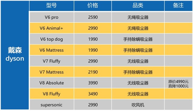 这些都对现有的产品线完成了一次技能上的全体晋级,那么跟着V10的呈现,V8还值得买?买戴森跟买iphone的逻辑有点像,便是一定要追着新品买,跟着戴森不断的晋级,马达类型也越来越多,那么此刻的V6/V7/V8还值不值得买了呢?我给的主张是:V7是低预算用户首选,现在价格比较适用,功能也适用,是性价比比较高的产品。V8Absolute作为从前的旗舰,价格直降1000到了3990元。假如不出V10性价比也很高,而V8Fluffy在少了一个地毯吸头的状况下价格也下调1000抵达3490元。作为我国顾客而言,地毯用的比较少,这个版别也是性价比杰出的一个版别。